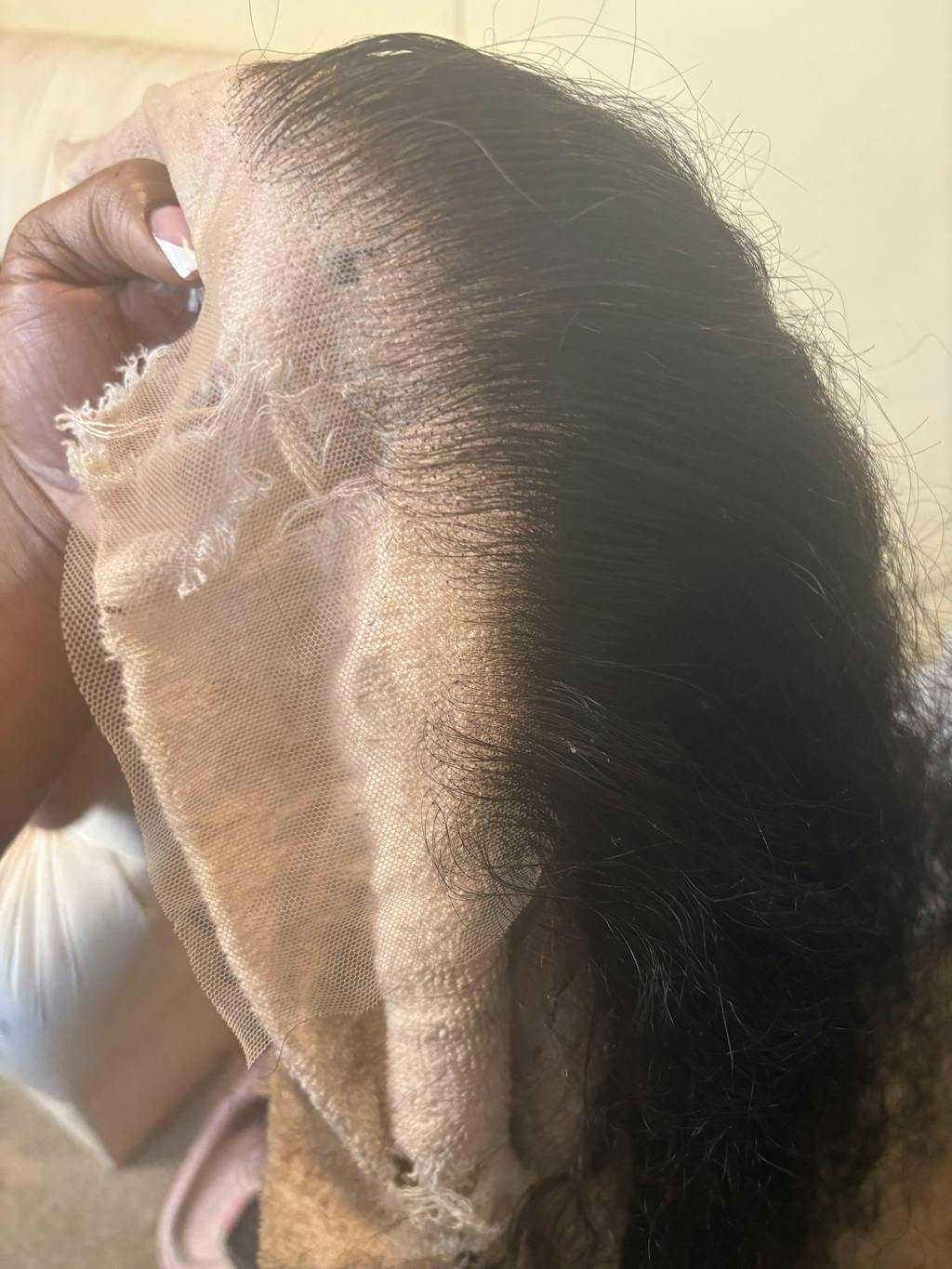 Riche B. La perruque est de très bonne qualité les noeuds sont très petits, la lace est transparente la longueur est vrai, rien à dire.